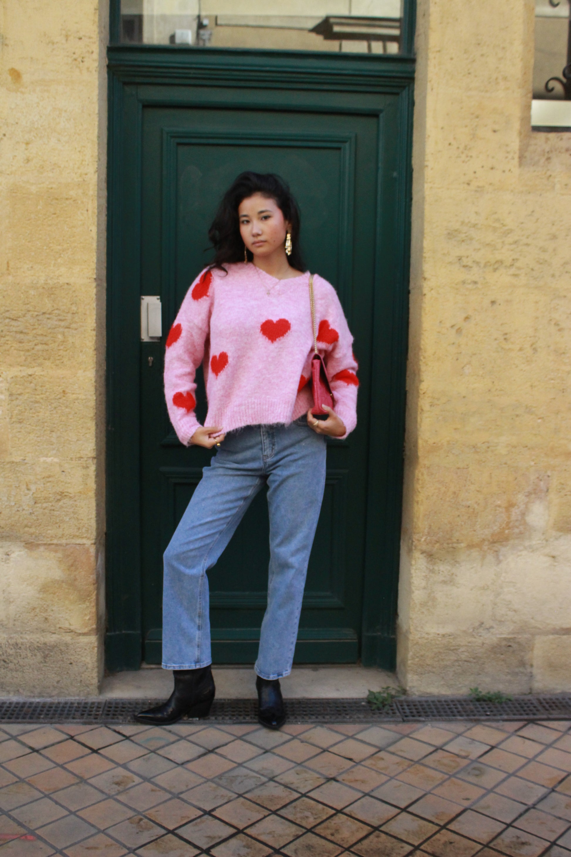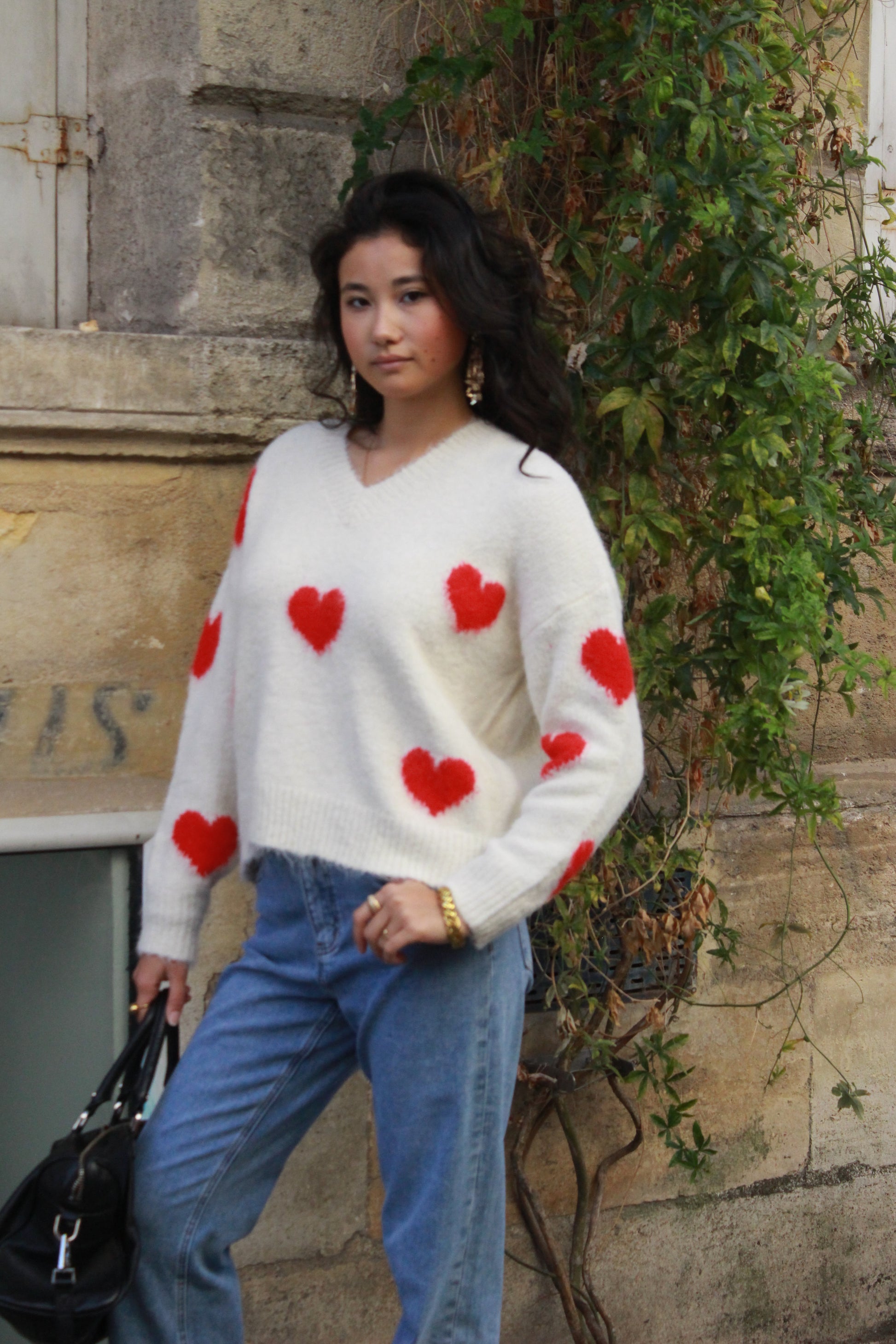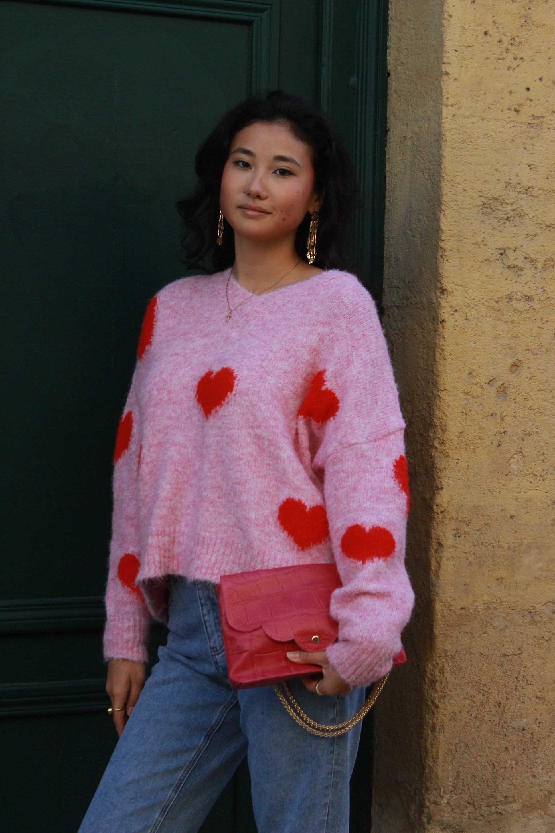 Disponible en rose et en blanc, ce pull tout doux se distingue par ses gros cĆurs rouges et son col en V Ă©lĂ©gant. Parfait pour un look fĂ©minin, cosy et tendance.