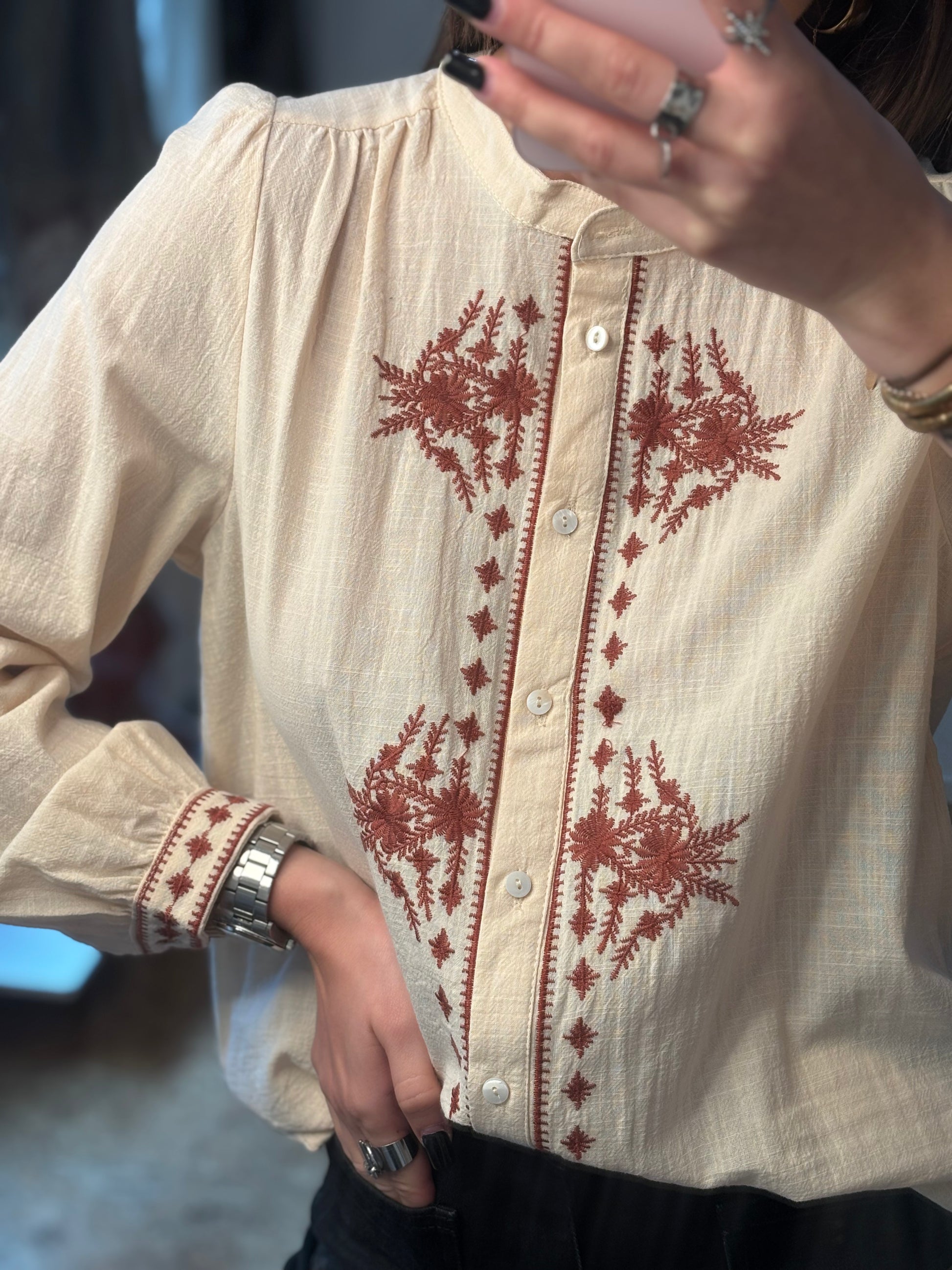 La blouse Éloïse, dans un beige doux, se distingue par ses motifs rose foncé disposés élégamment le long de la blouse et sur les manches, apportant finesse et originalité à la pièce. Confectionnée dans une matière agréable à porter, elle allie confort et style, parfaite pour une tenue automnale chic et raffinée.