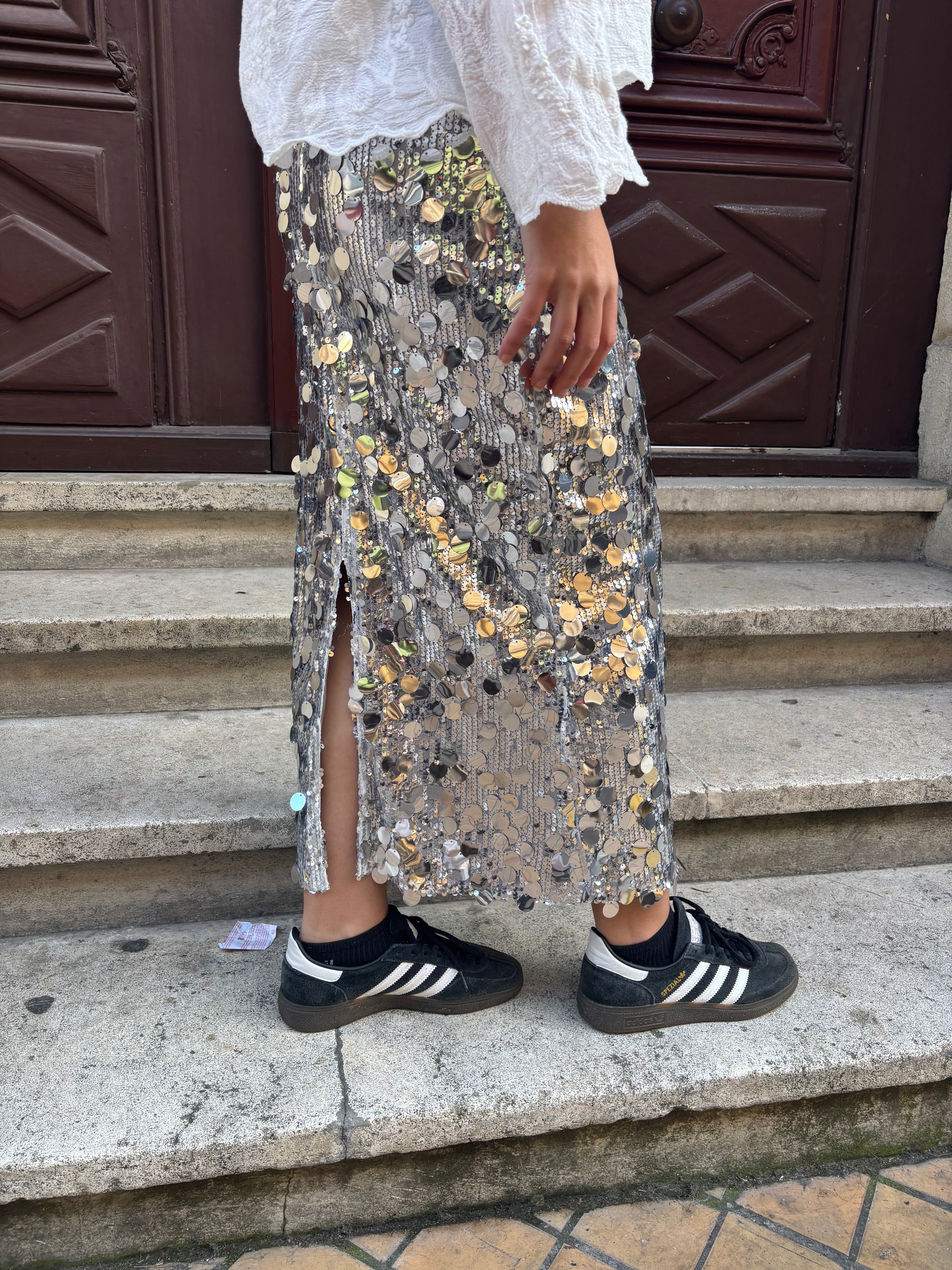 Fais scintiller tes soirées avec la jupe Stella, la pièce incontournable pour un look festif et audacieux. Recouverte de sequins argentés et dorés, elle offre une allure éblouissante. La fente subtile à l’arrière apporte une touche de modernité et de confort, parfaite pour danser avec élégance jusqu’au matin.