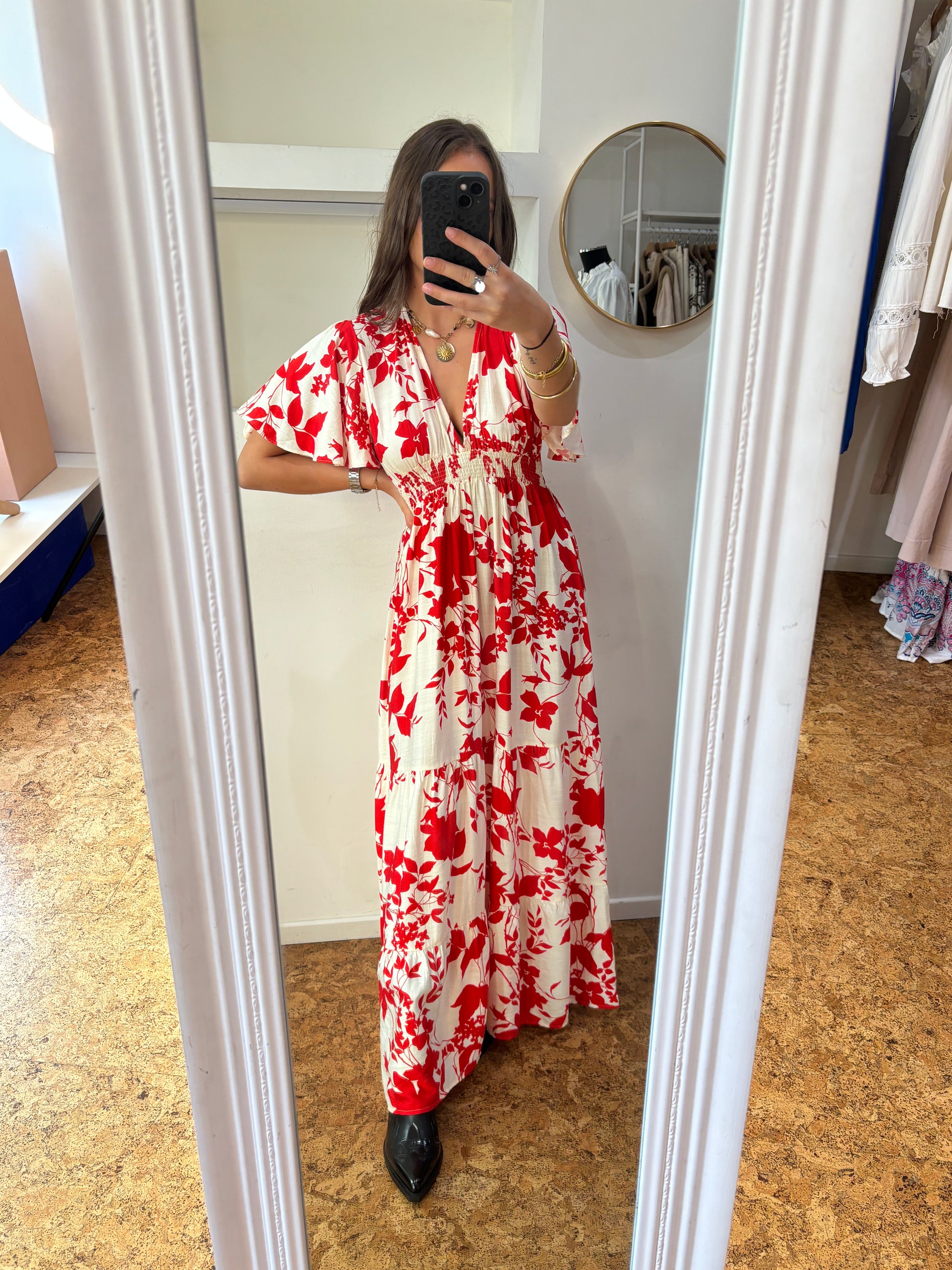 Blanche, ornée de feuilles rouges, elle allie fraîcheur et originalité. Son dos nu met en valeur la silhouette, tandis que l’élastique placé à l’arrière de la taille assure confort et maintien tout en soulignant les courbes.